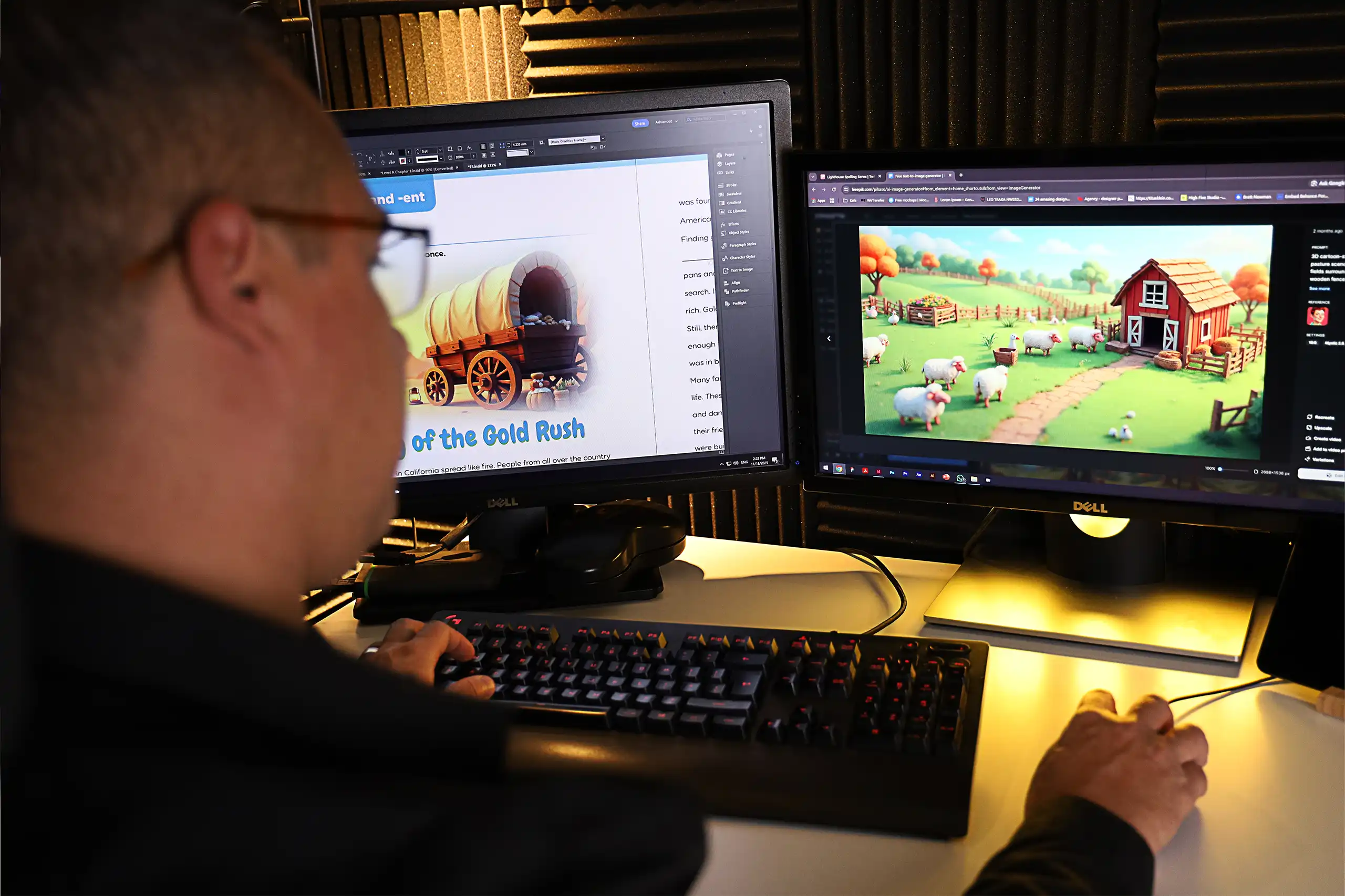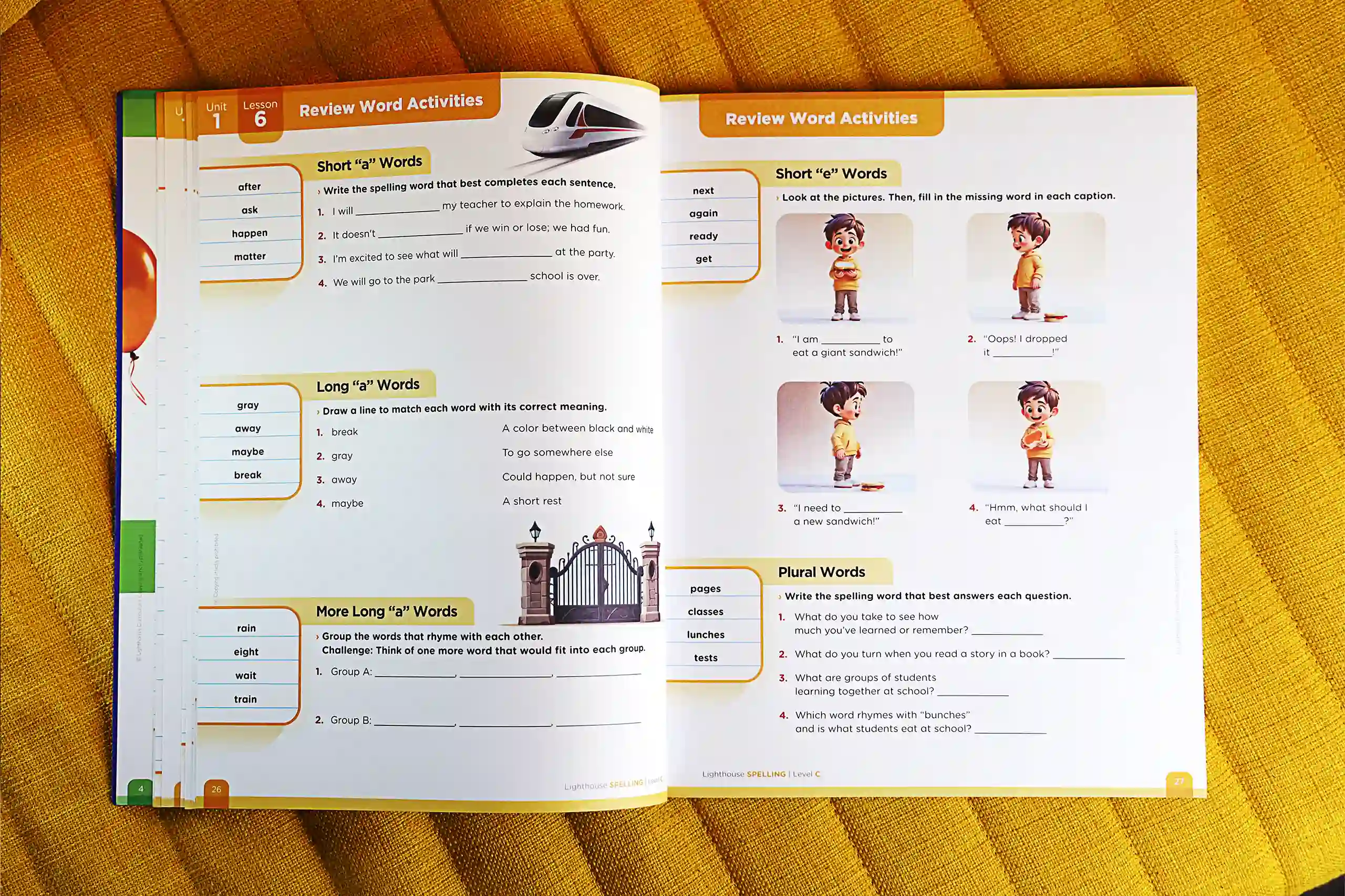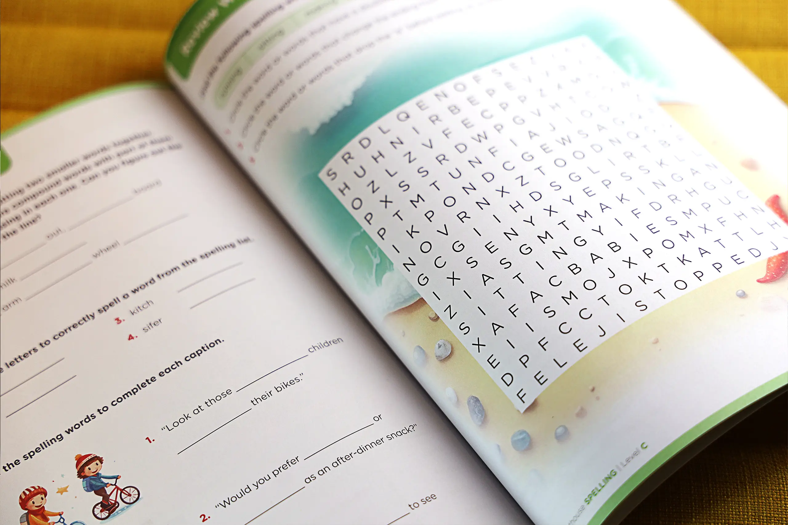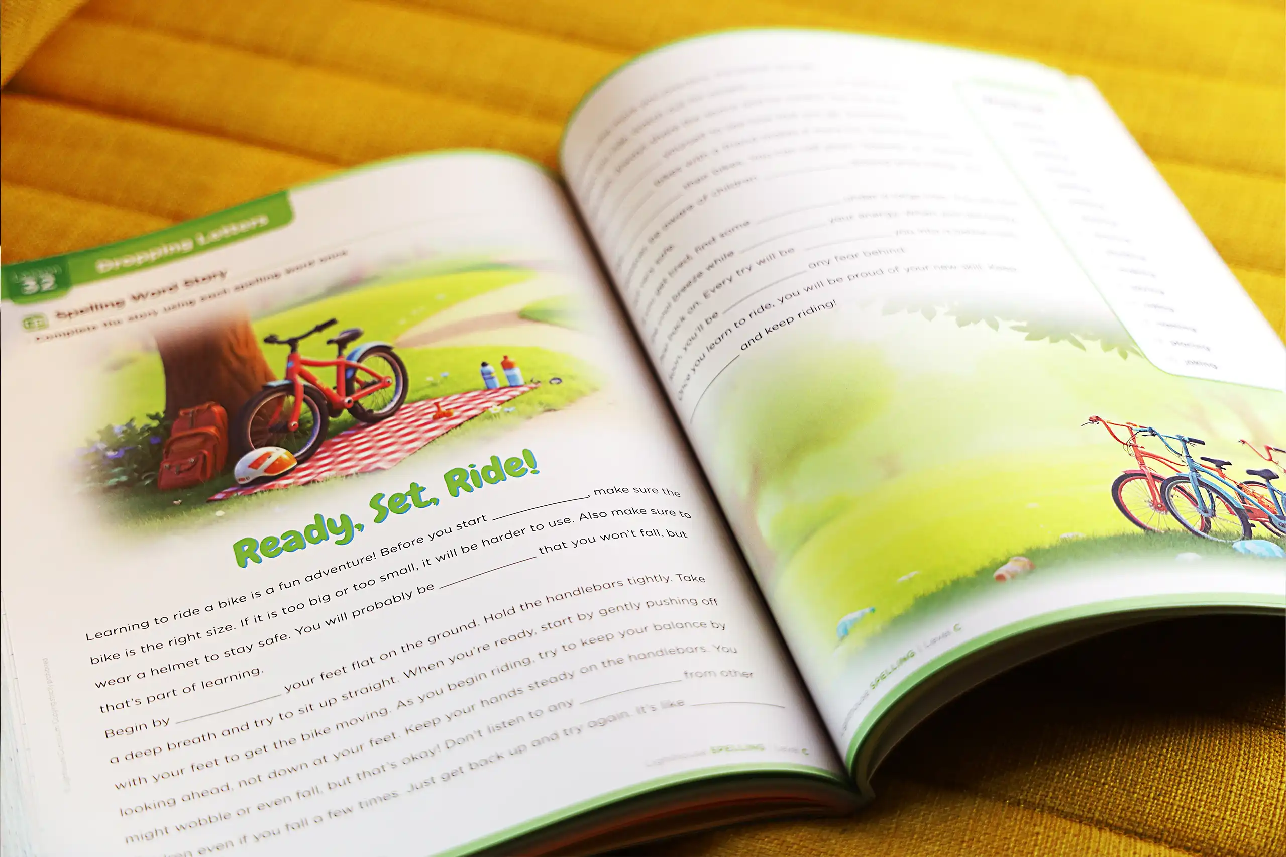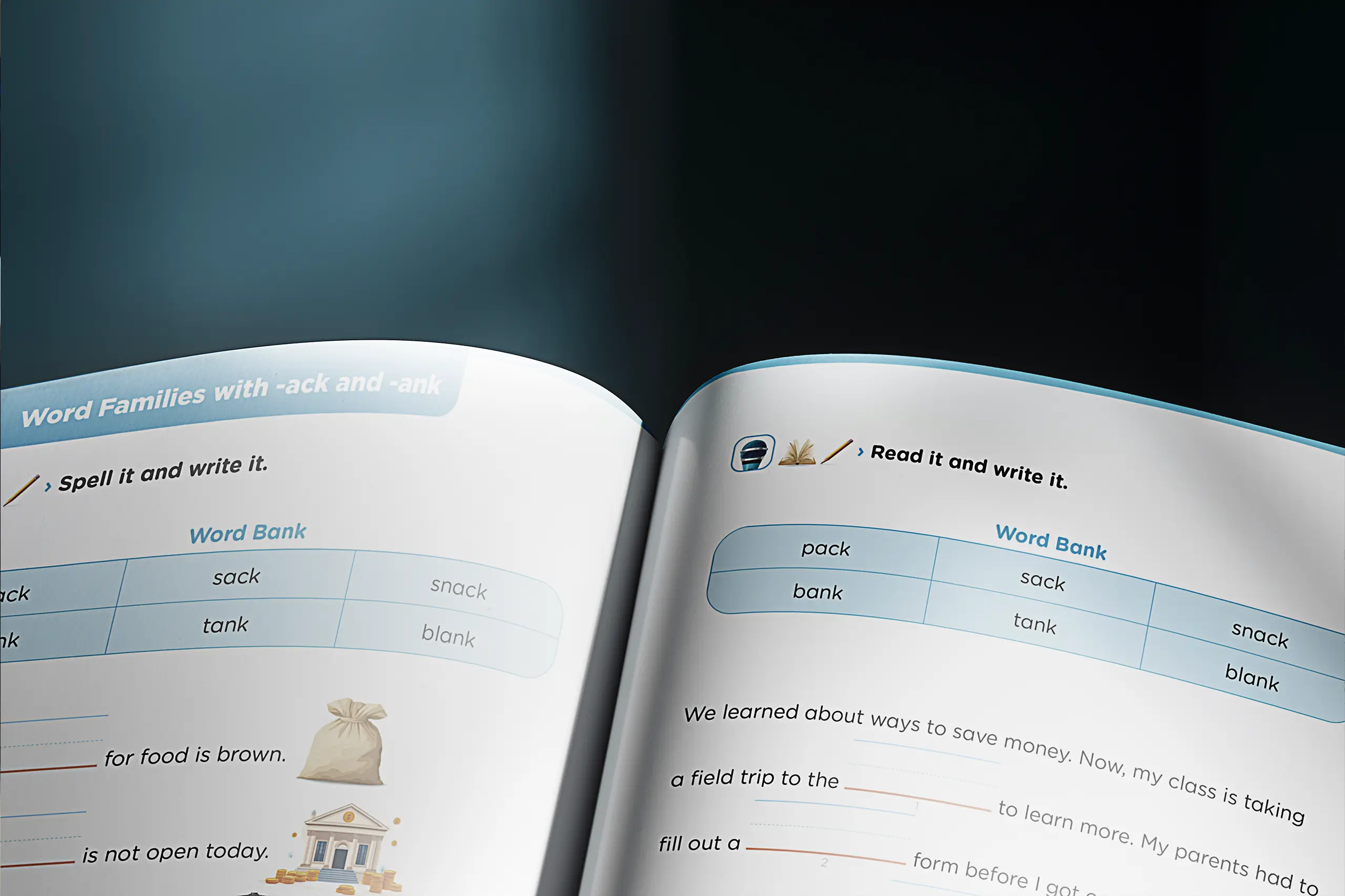 The Spelling Series adopted a consistent four-page lesson rhythm. Early grades include instructional icons (trace, write, spell, check) for students just beginning to read; older levels shift toward structured, mature text layouts. Illustrations were produced using a hybrid approach: curated stock illustrations, custom iconography, and AI-generated images trained through our developed prompt systems. The result: a warm, friendly, and age-appropriate aesthetic across 36 lessons per level.